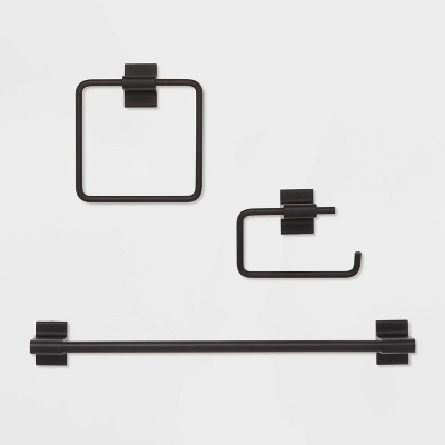 Update your bath space with a coordinated up-to-date look with this 3-Piece Modern Bath Hardware Set from Threshold™. The strong SnapGrip®️ technology makes for a quick and easy installation. This 3-piece bath hardware set comes with an 18-inch towel bar, towel ring and bathroom tissue holder. Each component is made from sturdy stainless steel and aluminum. Finished in eye-catching matte black, the universal design of this set coordinates with a wide range of bathroom decor. Hang a hand towel from the towel ring, dry out bath towels on the towel bar, and add some style to dispensing your bathroom tissue with the bathroom tissue holder. Mounting components easily install with the included hardware and are concealed for a streamlined look.