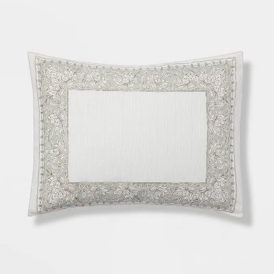 The Richland Floral Comforter Set from Threshold™ will give your bedroom a fresh, blooming update. This eight-piece bedding set includes a soft-filled comforter, two Euro shams, two pillow shams, two decorative pillows and a bedskirt to transform your bedroom into a restful retreat in no time. The comforter features a lovely black and white floral pattern over a textured light green base to brighten the top of your bed with a garden-inspired look. The two Euro shams in white are trimmed with light green edging, the square decorative pillow in green has fringed edges, while the two shams and a rectangular decorative pillow in white have a bordered floral design for a designer look. The bedskirt with 15-inch drop length provides the perfect finishing touch with its crisp white color. Machine-washable for easy care, this percale bedding set will make your bedroom a stunning setup by day and a cozy sanctuary at night.