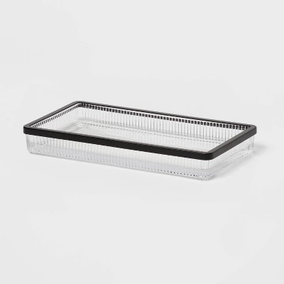 Maintain a clutter-free bathroom with this Ribbed Glass Tray from Threshold™. Designed in a rectangular silhouette, this glass bath tray features raised edges that help keep small vanity items or bottles contained. Showcasing a ribbed glass finish with a metallic black rim, it’s sure to bring sleek style to your bathroom decor.
